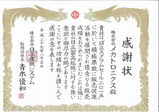 2015 · 9月 02日, 2015年 「㈱日立産機システム」様 日立スクラムセール2015 感謝状 「株式会社日立産機システム」様より、2015年度の販売促進活動の功績に対し、感謝状を拝受しました! お知らせ一覧(2015) tagPlaceholderカテゴリ: