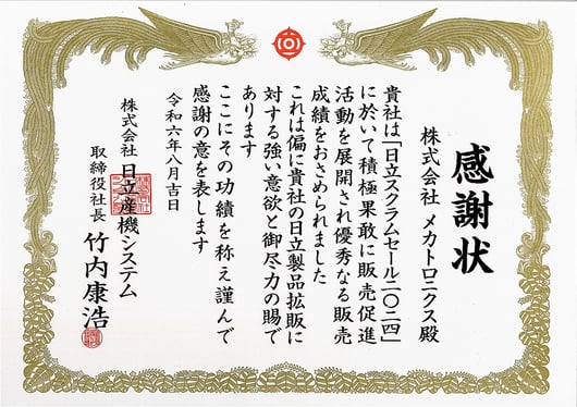 2024 · 8月 30日, 2024年 「㈱日立産機システム」様 日立スクラムセール2024 感謝状 「株式会社日立産機システム」様より、2024年度の販売促進活動の功績に対し、感謝状を拝受しました! お知らせ一覧(2024) tagPlaceholderカテゴリ: